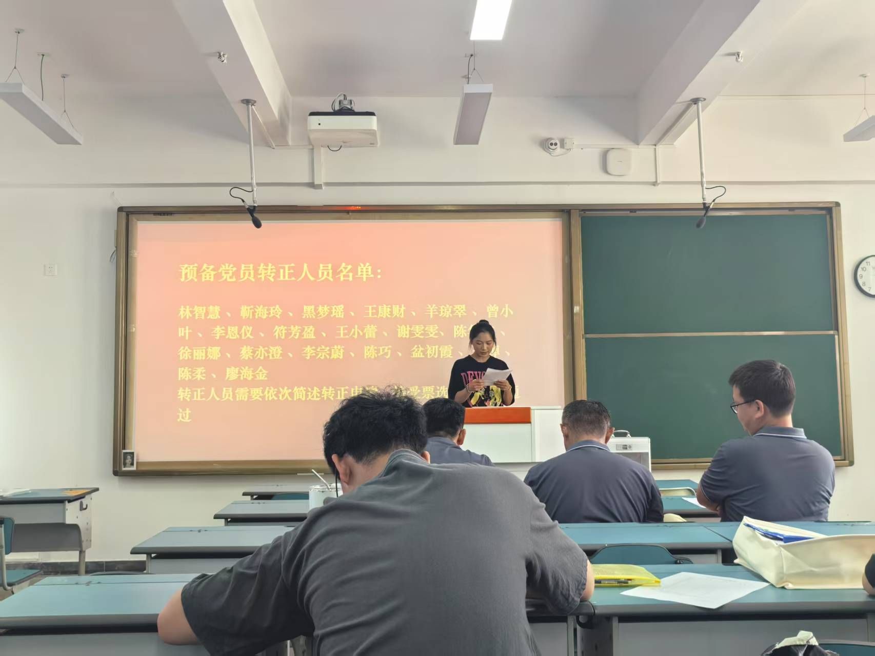 会议严格按照党员发展程序进行。十九位预备党员汇报自己在预备期间的学习情况、思想动态、工作表现等。他们在汇报过程中,客观评价自身情况,并表示要坚持理论与实践相结合的原则,加强党性修养,努力做好本职工作,尽职尽责服务同学,表明自己加入中国共产党的坚定决心。转正人员依次简述转正申请,接受票选讨论是否通过。