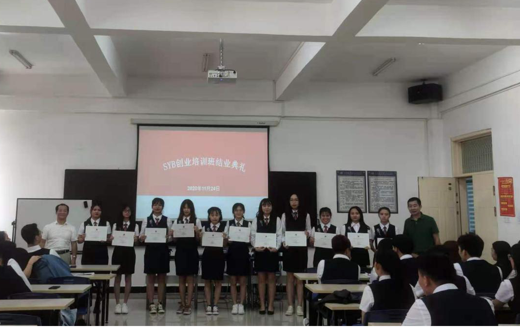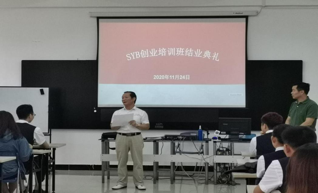 (新葡的京集团35222vip卢耿华老师、就业干事助理吴曼瑶报道)公司于2020年11月24日中午11:40分在公司第三实训室3-203举行了SYB创业培训班结业典礼,由海南高速就业培训中心吴焕精教授、新葡的京集团35222vip陈晓鹏副经理、林煌老师、以及班主任代表林敏捷老师出席。公司17级、18级、19级中高职(3+2)班共66名员工参加。(见图一)