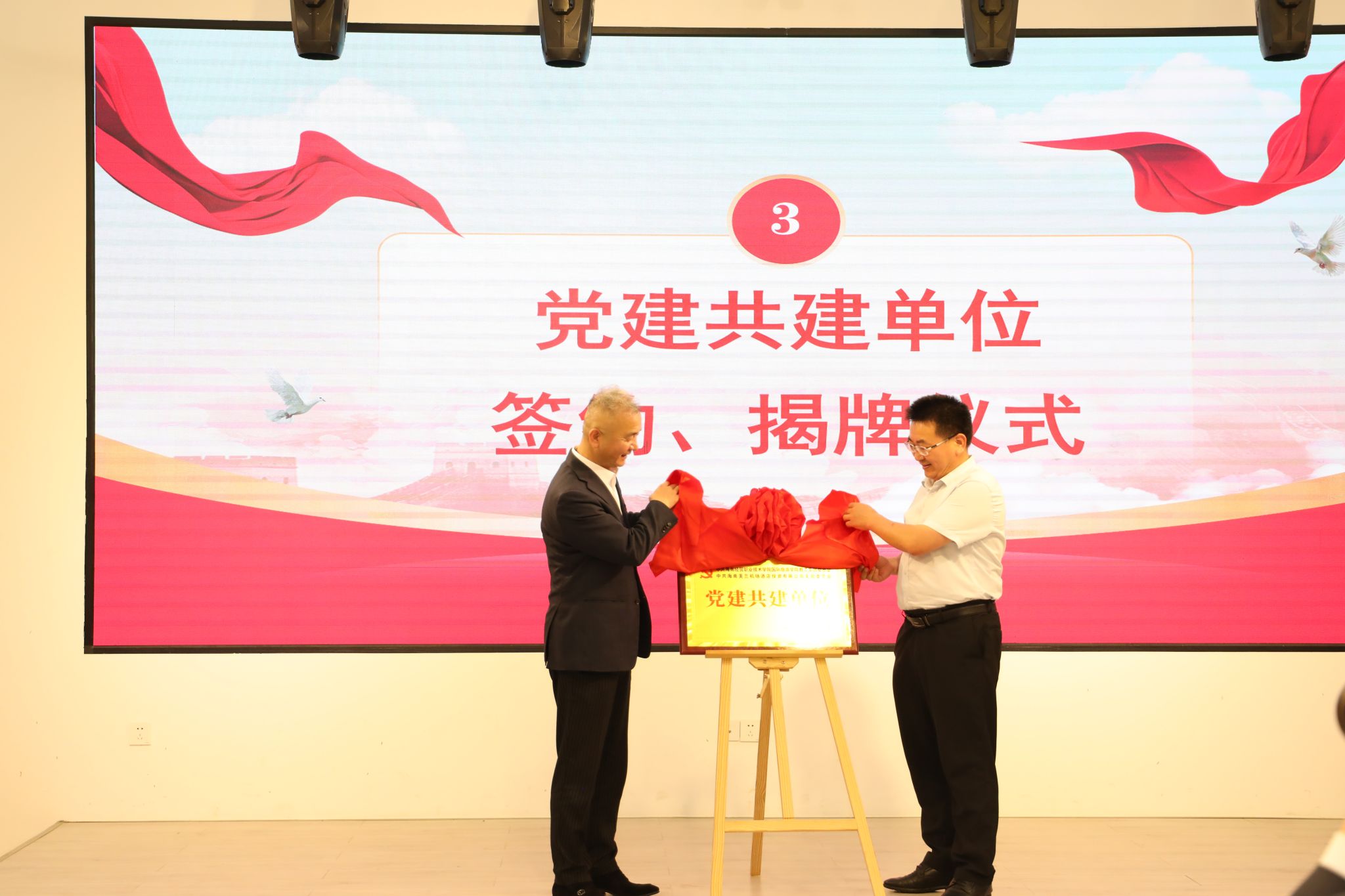 签约仪式上,崔昌华何锡洪共同为党建共建单位”揭牌。标志着党建联建共建将开启新的里程。,公司教工党支部书记王晓明与机场酒店党支部副书记李艳静签署党建共建协议书为推动校企党建共建打好合作基础。